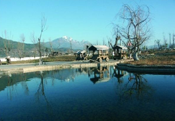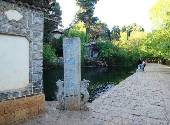 束河龙泉山下古树参天,一道好水积成九鼎龙潭。潭水清澈晶莹,水草曼舞,游鱼逍遥,玉龙雪山倒映其中,清姿傲岸,意境无穷,成为束河八景之一又一景:“雪山倒映”。